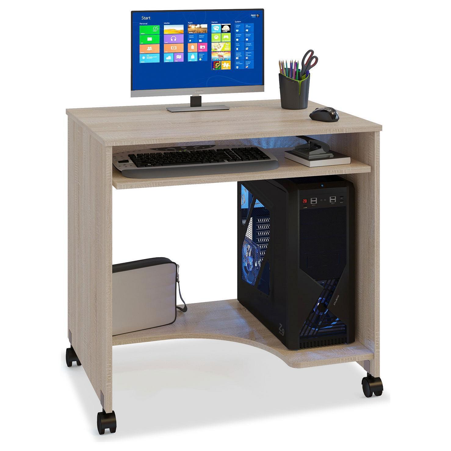 Дети делают на нем домашние задания, взрослые с его помощью зарабатывают деньги – компьютер актуален для всех. Стол компьютерный КСТ-15 – то, что нужно, чтобы создать качественное рабочее пространство, позволяющее расположиться с максимальным комфортом. Эта модель создана компанией 2406121, серия «КСТ-15», на товар предоставляется гарантия (24 мес.). Матовый корпус изготовлен из прочного и надежного материала (ЛДСП Е1) и отлично впишется в любой интерьер благодаря выигрышному оттенку (дуб сонома). Столешница, толщина которой составляет 16 мм (материал столешницы), имеет матовый верх, при этом общие габариты компьютерного стола составляют 800 мм в ширину и 770 мм в высоту. Производитель также включил в комплект колесики, 2 полки.