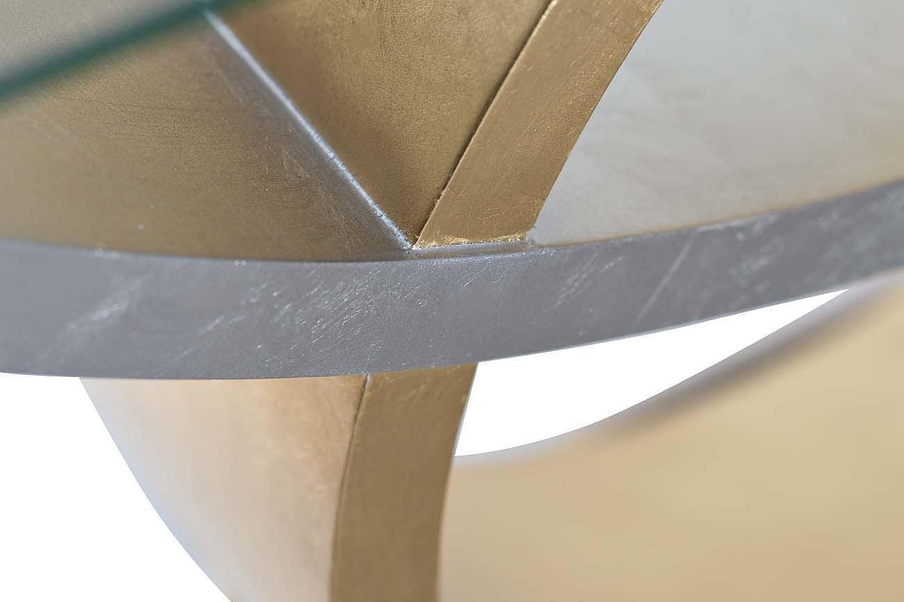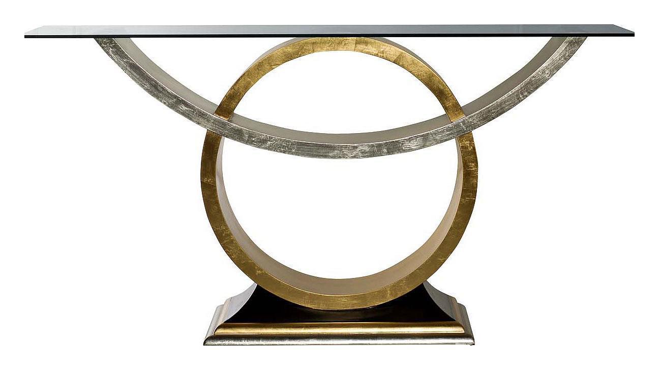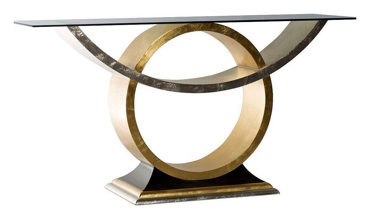 Основным назначением модели, представляющей собой разновидность компактного столика, является рациональная организация пространства помещения. Стол используется в качестве подставки под бытовую технику и различные предметы интерьера, аксессуары. Оригинально выглядит необычной формы консоль в современном стиле, материалами изготовления которой являются стекло и МДФ. Сочетание золотистого и серебристого цветов можно назвать оптимальным, поскольку изделие идеально впишется в интерьер, оформленный в различных цветовых решениях. Необычная консоль со стеклом визуально расширяет пространство помещения, делая его более легким. Модель выглядит дорого и роскошно, прекрасно сочетаясь с мягкой мебелью и другими элементами интерьера помещения.