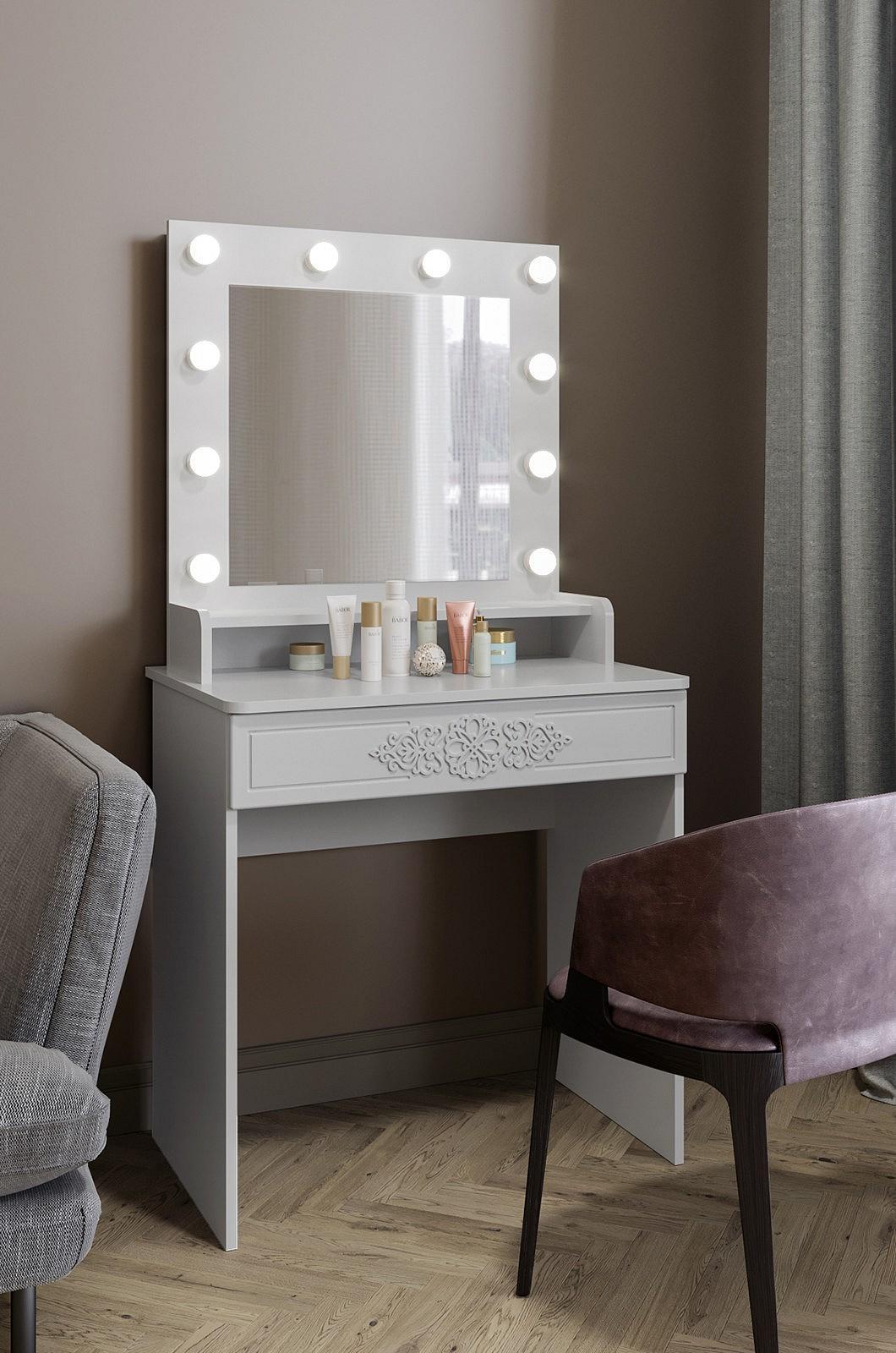 В ящике стола установлены телескопические направляющие полного выдвижения, обеспечивающие его плавный ход. Зеркало оснащено лампами с трех сторон, свет распределяется равномерно, что идеально для ухода за лицом и нанесения макияжа.