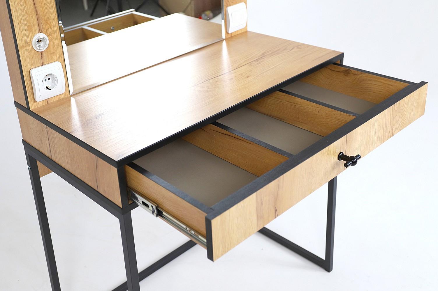 Полюбить себя и почувствовать настоящей женщиной – непростая задача, для этого нужно уметь ухаживать за собой, баловать профессиональной косметикой и, конечно, приобрести стол туалетный Берген 2 MBW_101449. Данная модель сделана востребованным брендом Mebwill. Это изделие относится к коллекции «Берген 2» и стоит 11480 руб. В комплект входит зеркало,, 1 ящик. Матовый корпус создан в изысканном оттенке «дуб крафт золотой, черный», который прекрасно сочетается с расцветкой фасада (дуб крафт золотой), сделанного из ЛДСП Е1. Благодаря комфортным габаритам (изделие длиной 1400 мм, шириной 800 мм и с выступом 450 мм), вы сможете разместить все необходимое, сохранив при этом полезное пространство в вашем женском уголке.