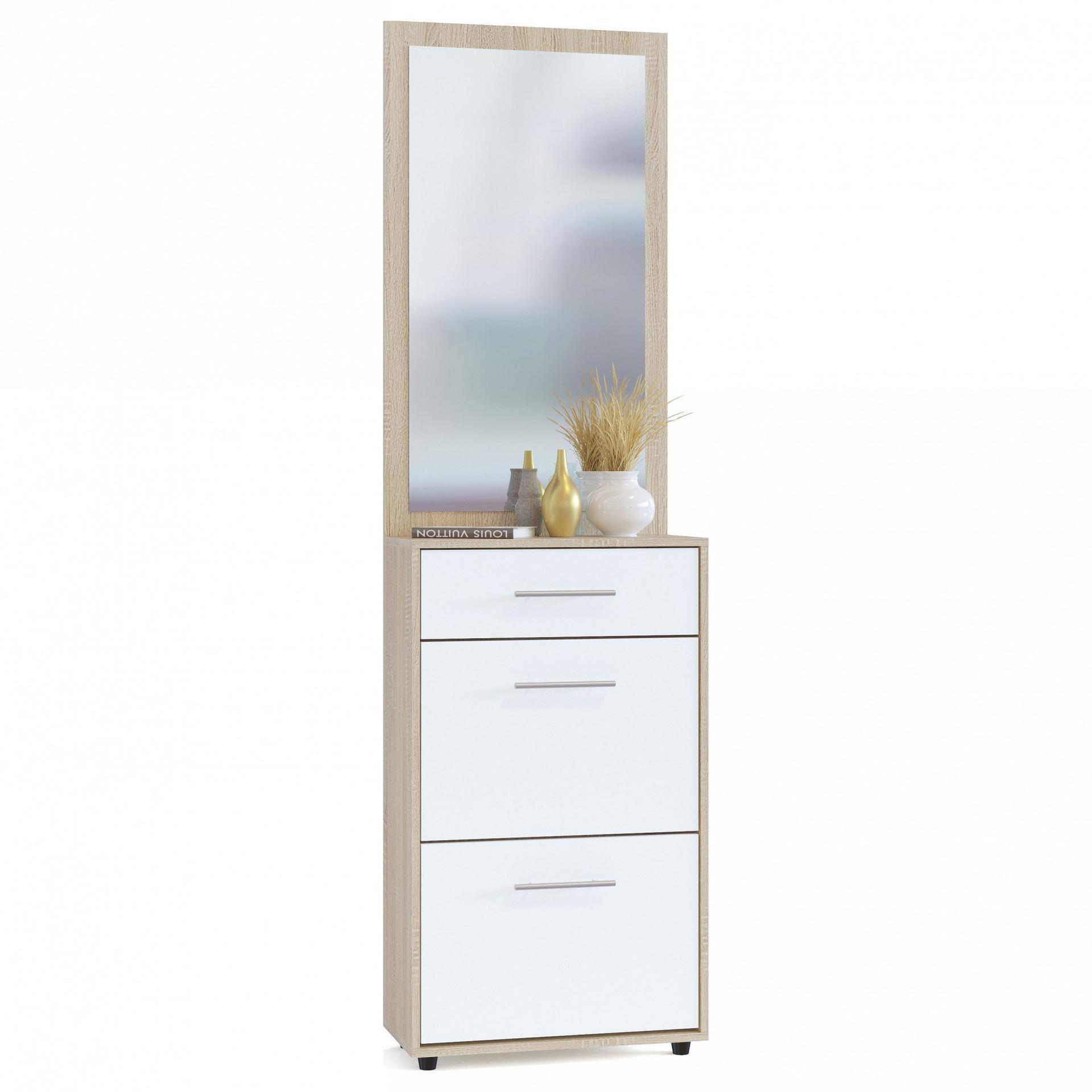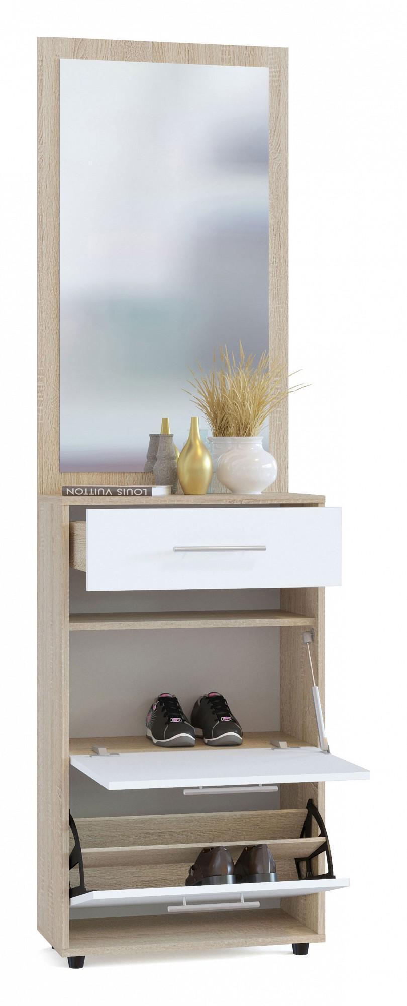 Полюбить себя и почувствовать настоящей женщиной – важная задача, для этого нужно уметь ухаживать за собой, баловать профессиональной косметикой и, конечно, приобрести трюмо ТП-2+ПЗ-3 SK_52490. Данная модель сделана востребованным брендом Сокол. В комплект входит тумба для обуви - 600x287x1043 мм;, зеркало настенное - 600x1044 мм. Матовый корпус создан в изысканном оттенке «дуб сонома», который отлично сочетается с расцветкой фасада (белый), сделанного из ЛДСП Е1. Благодаря комфортным параметрам (изделие длиной 2087 мм, шириной 600 мм и с выступом 287 мм), вы сможете разместить все необходимое, сохранив при этом полезное пространство в уголке для женских секретов.