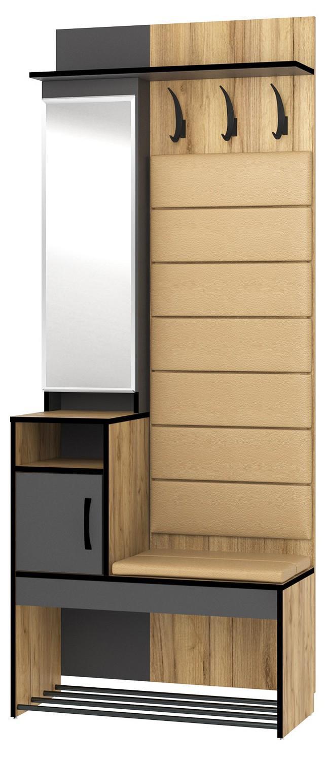 Когда все вещи находятся на своих местах – это залог красивого и аккуратного интерьера. Тем приятнее, когда зоной для хранения является вместительная и надежная вешалка с тумбой Ольга-лофт 1 MBW_100980. Данная модель изготовлена компанией Mebwill и относится к коллекции «Ольга-лофт 1». Матовый корпус изделия сделан из популярного материала (ЛДСП Е1) и окрашен в благородный оттенок «дуб крафт золотой». Производитель предлагает комплектацию, в которую входит: зеркало, 1 дверца,, 1 полка для обуви,, 2 полки, 3 крючка. Вешалка с тумбой Ольга-лофт 1 стоит 12985 руб.